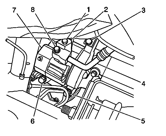 2. Remove the suction hose mounting bolt (1) from the A/C compressor (7).