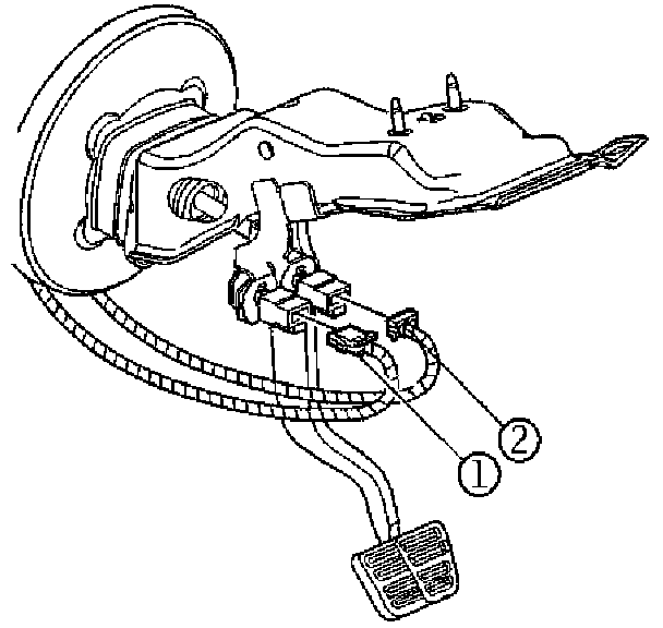 There are two switches above the brake pedal - the cruise control switch (1) and the stop lamp switch (2). The cruise control switch is in the outboard position and the stop lamp switch is in the inboard position.