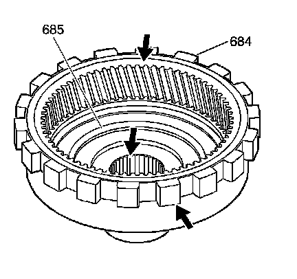 3. Inspect the internal reaction gear (684) and the internal reaction gear support (685) for proper assembly, stripped splines, cracks, teeth, and lug damage.