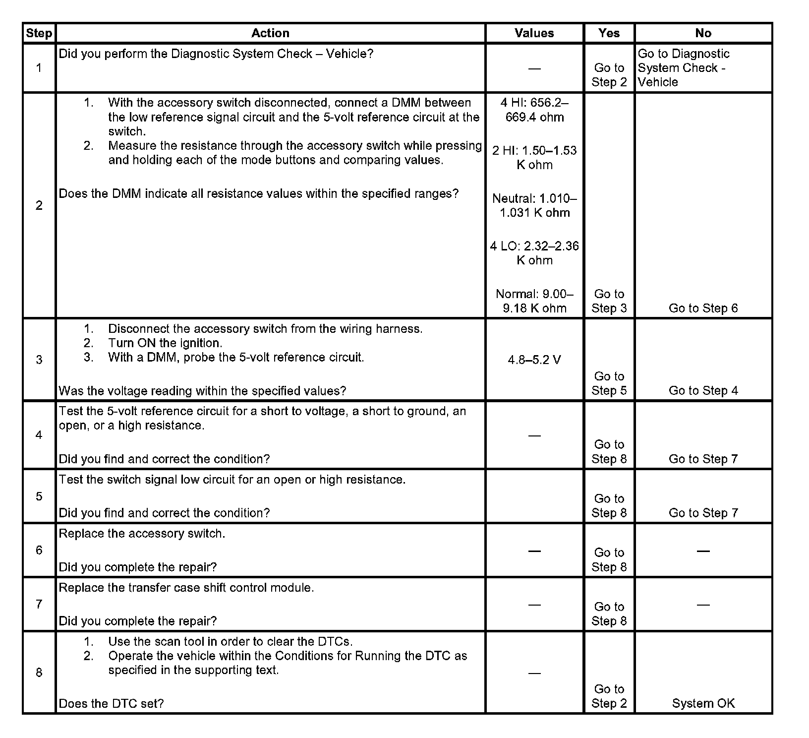 The accessory switch circuit consists of 4 modes. The transfer case shift control module supplies 5 volts to the switch through the switch signal circuit. The current travels through the resistor of the currently active mode. The current on the switch signal circuit is monitored by the transfer case shift control module. The voltage on the switch signal circuit will vary depending on which mode button is pressed by the driver.