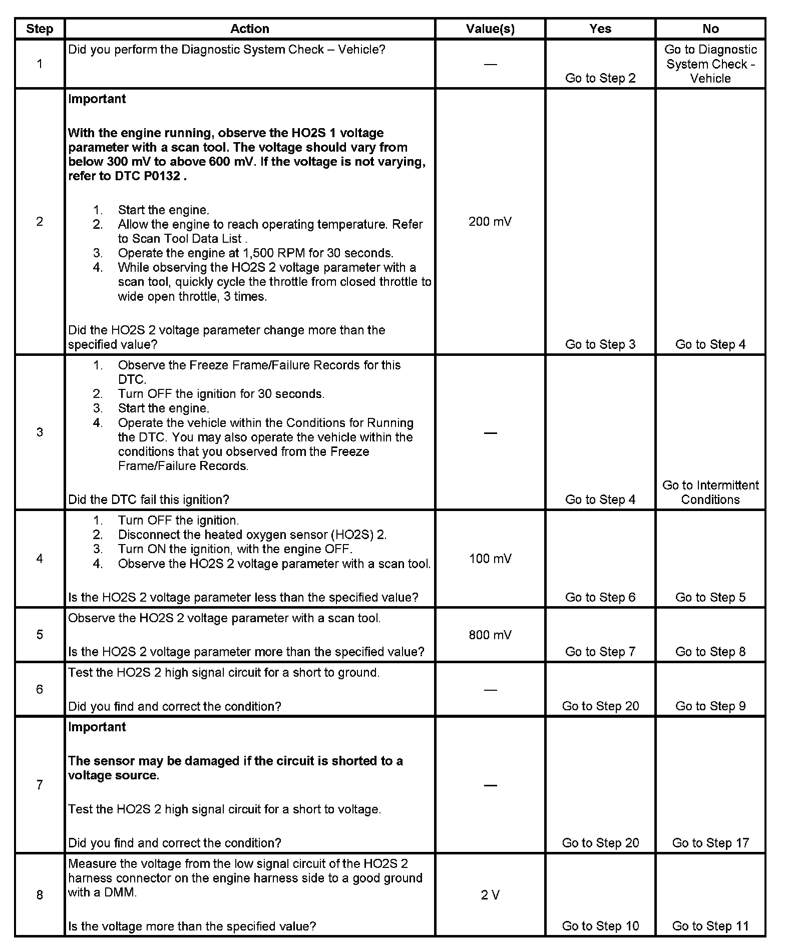 Heated oxygen sensors (HO2S) are used for fuel control and post catalyst monitoring. Each HO2S compares the oxygen content of the surrounding air with the oxygen content in the exhaust stream. The HO2S must reach operating temperature to provide an accurate voltage signal. Heating elements inside the HO2S minimize the time required for the sensors to reach operating temperature. The powertrain control module (PCM) supplies the HO2S with a reference, or bias, voltage of about 450 mV. When the engine is first started the PCM operates in open loop, ignoring the HO2S voltage signal. Once the HO2S reaches operating temperature and closed loop is achieved, the HO2S generates a voltage within a range of 0-1,000 mV that fluctuates above and below bias voltage. High HO2S voltage indicates a rich exhaust stream; low HO2S voltage indicates a lean exhaust stream. If the PCM detects an HO2S voltage that stays below a specified value, DTC P0137 will set for HO2S 2.
