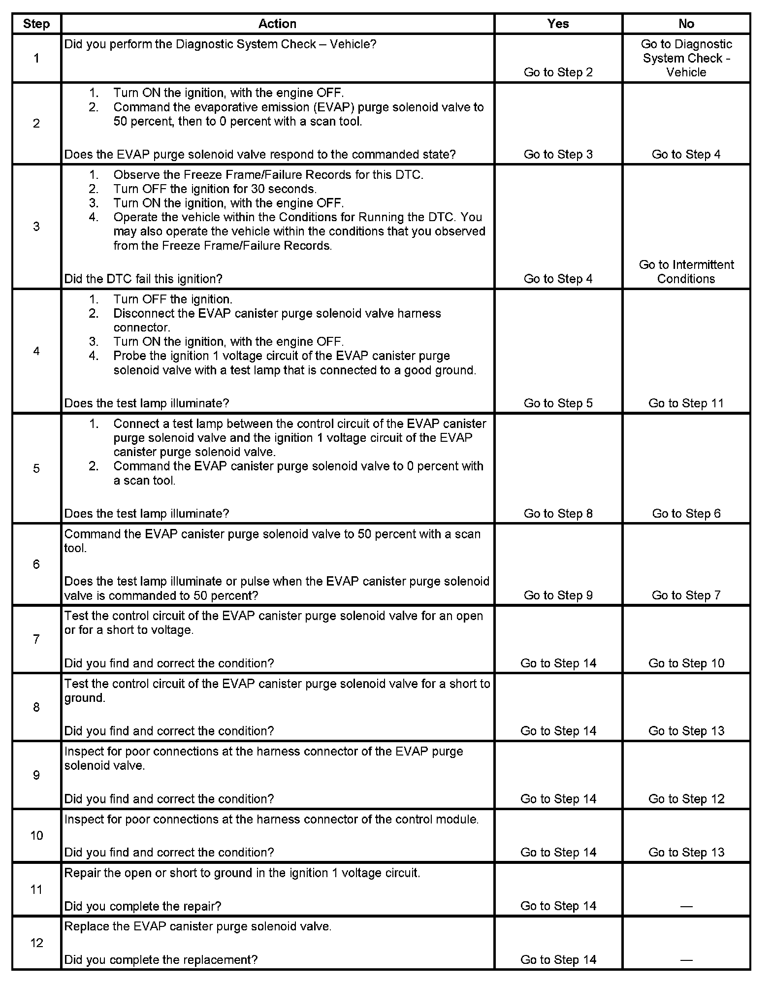 An ignition voltage is supplied directly to the evaporative emission (EVAP) canister purge solenoid valve. The EVAP canister purge solenoid valve is pulse width modulated (PWM). The scan tool displays the amount of ON time as a percentage. The control module monitors the status of the driver. The control module controls the EVAP canister purge solenoid valve ON time by grounding the control circuit via an internal switch called a driver. If the control module detects an incorrect voltage for the commanded state of the driver, this DTC sets.
