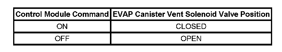 The table illustrates the relationship between the ON and OFF states, and the OPEN or CLOSED states of the EVAP canister vent solenoid valve.