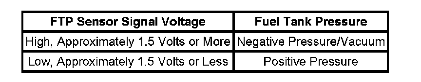 The table illustrates the relationship between FTP sensor signal voltage and the EVAP system pressure/vacuum.
