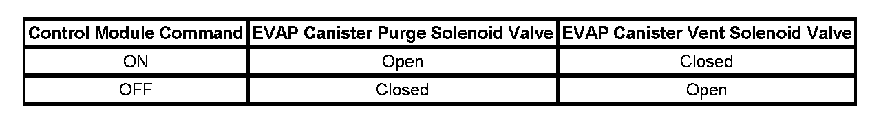 The table illustrates the relationship between the ON and OFF states, and the Open or Closed states of the EVAP canister purge and vent solenoid valves.