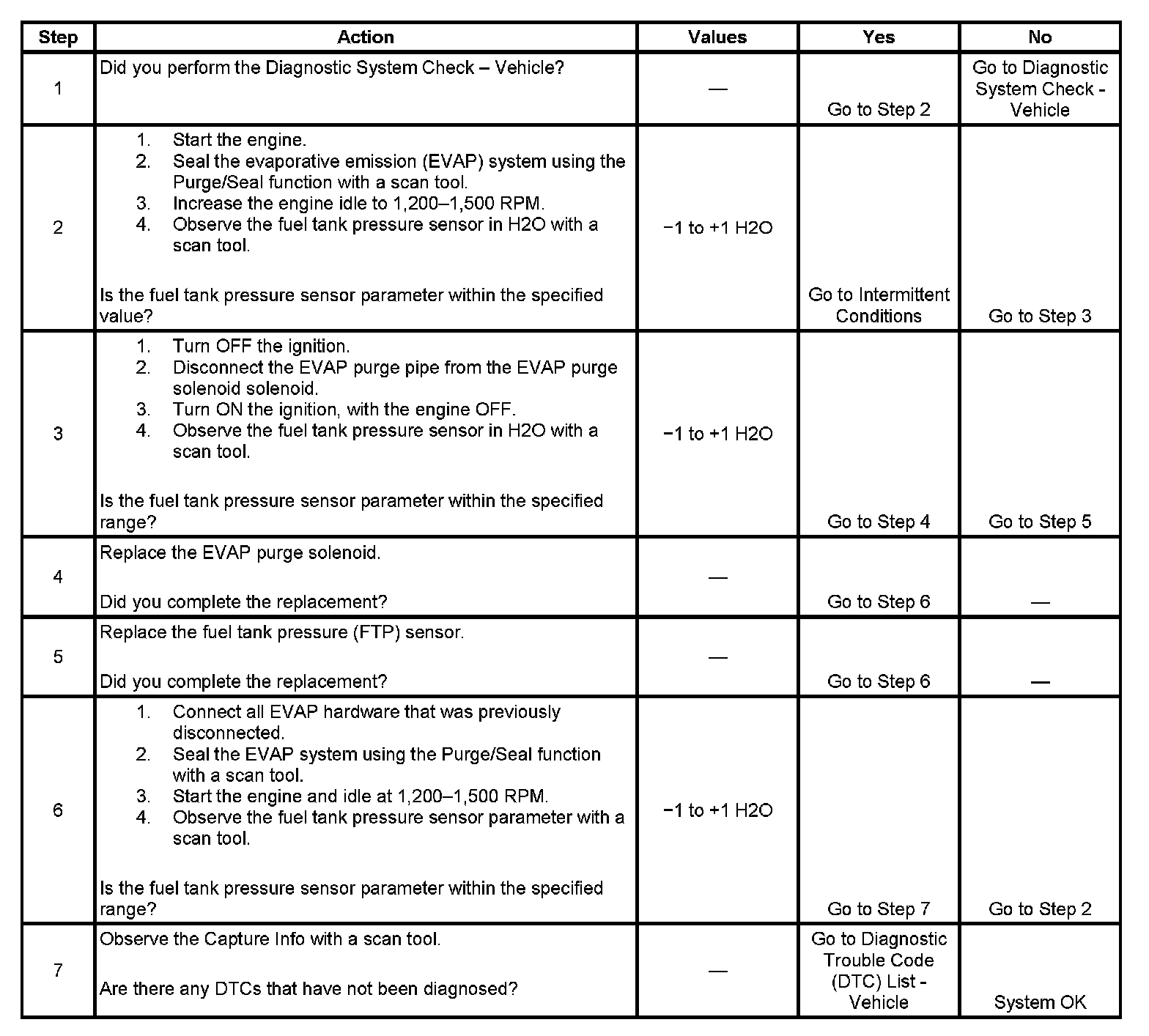 This DTC tests for undesired intake manifold vacuum flow to the evaporative emission (EVAP) system. The control module seals the EVAP system by commanding the EVAP canister purge solenoid valve Closed and the EVAP canister vent solenoid valve Closed. The control module monitors the fuel tank pressure (FTP) sensor to determine if a vacuum is being drawn on the EVAP system. If vacuum in the EVAP system is more than a predetermined value within a predetermined time, this DTC sets.