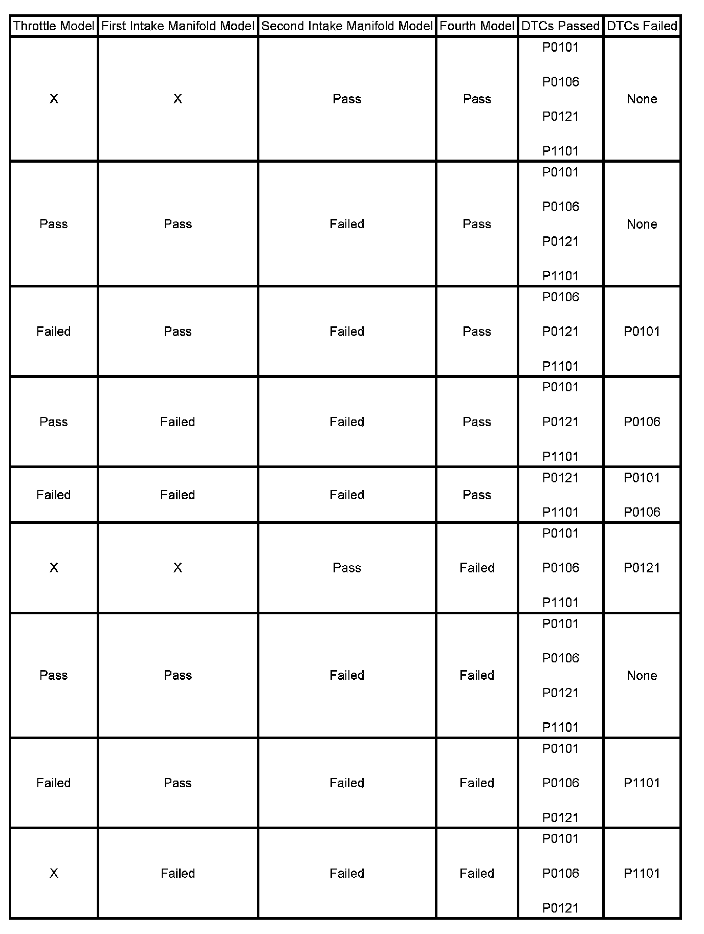 The estimates of MAF and MAP obtained from this system of models and calculations are then compared to the actual measured values from the MAF, MAP, and the TP sensors and to each other to determine the appropriate DTC to fail. The table illustrates the possible failure combinations and the resulting DTC or DTCs.