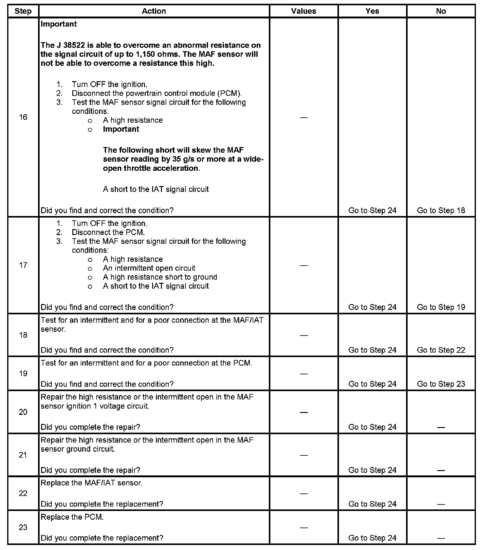 16. This step will determine if an abnormal resistance of less than 1,150 ohms has skewed the MAF sensor frequency signal.