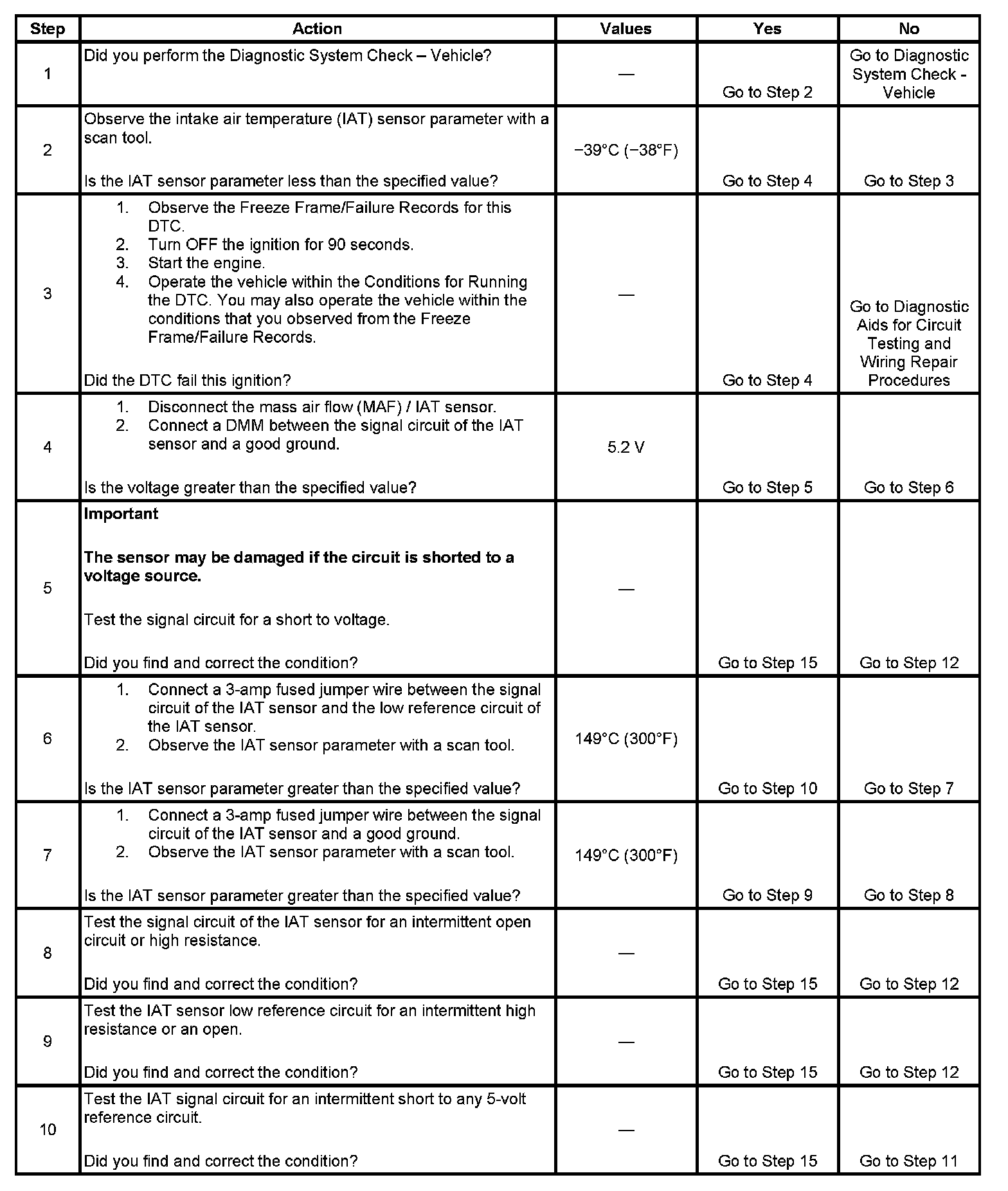 The PCM detects that the IAT sensor parameter is less than -39°C (-38°F) intermittently for more than 5 seconds.