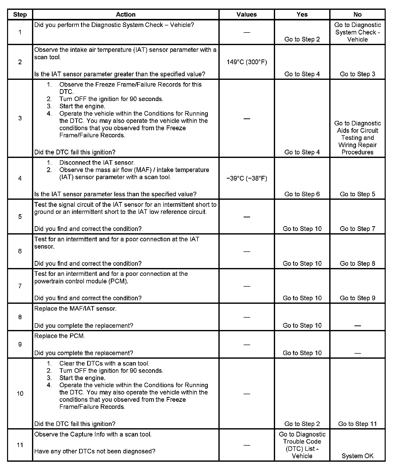 The PCM detects that the IAT sensor parameter is more than 149°C (300°F) intermittently for more than 5 seconds.