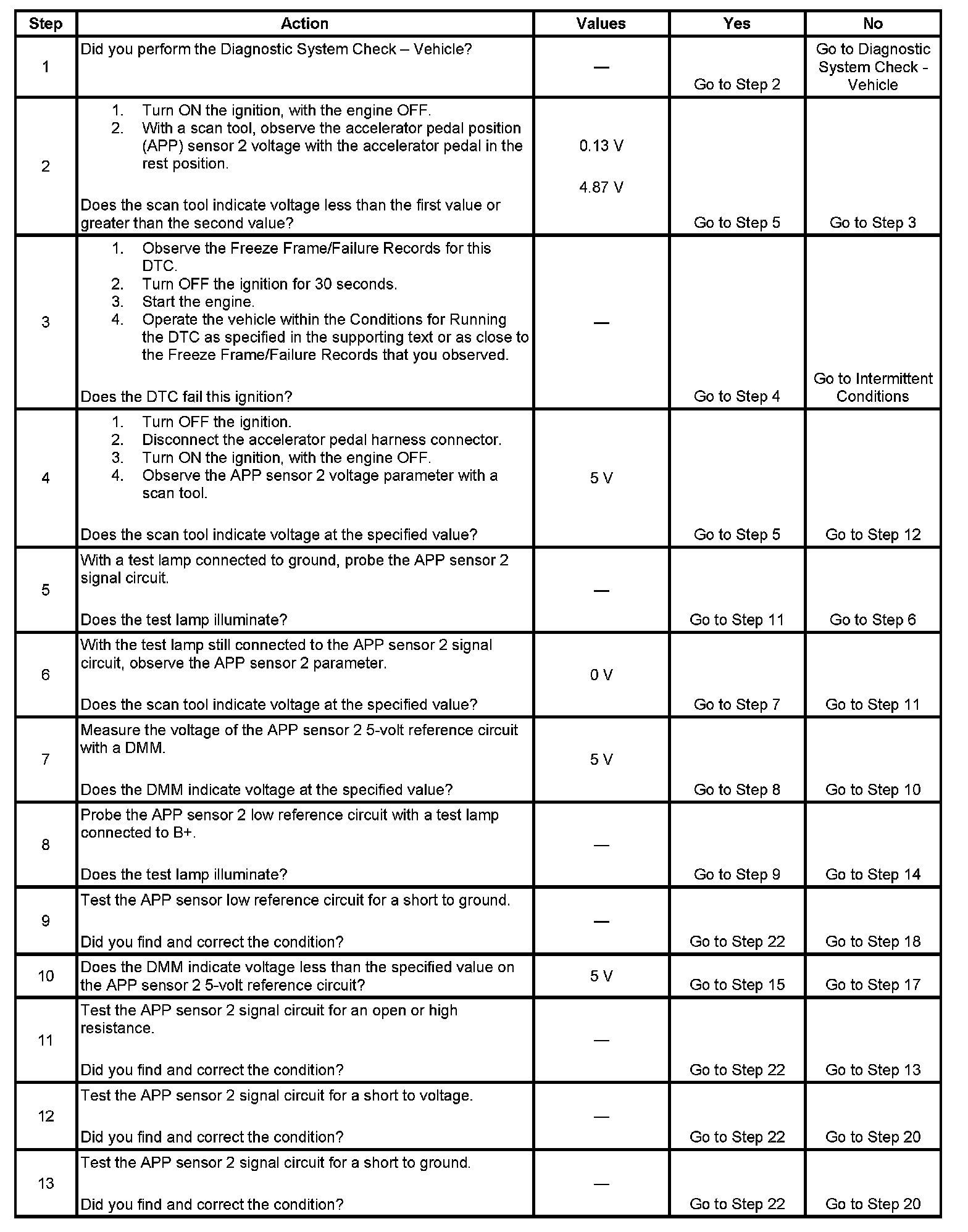 The APP sensor 2 voltage is less than 0.13 volt or more than 4.87 volts for more than 0.5 second.