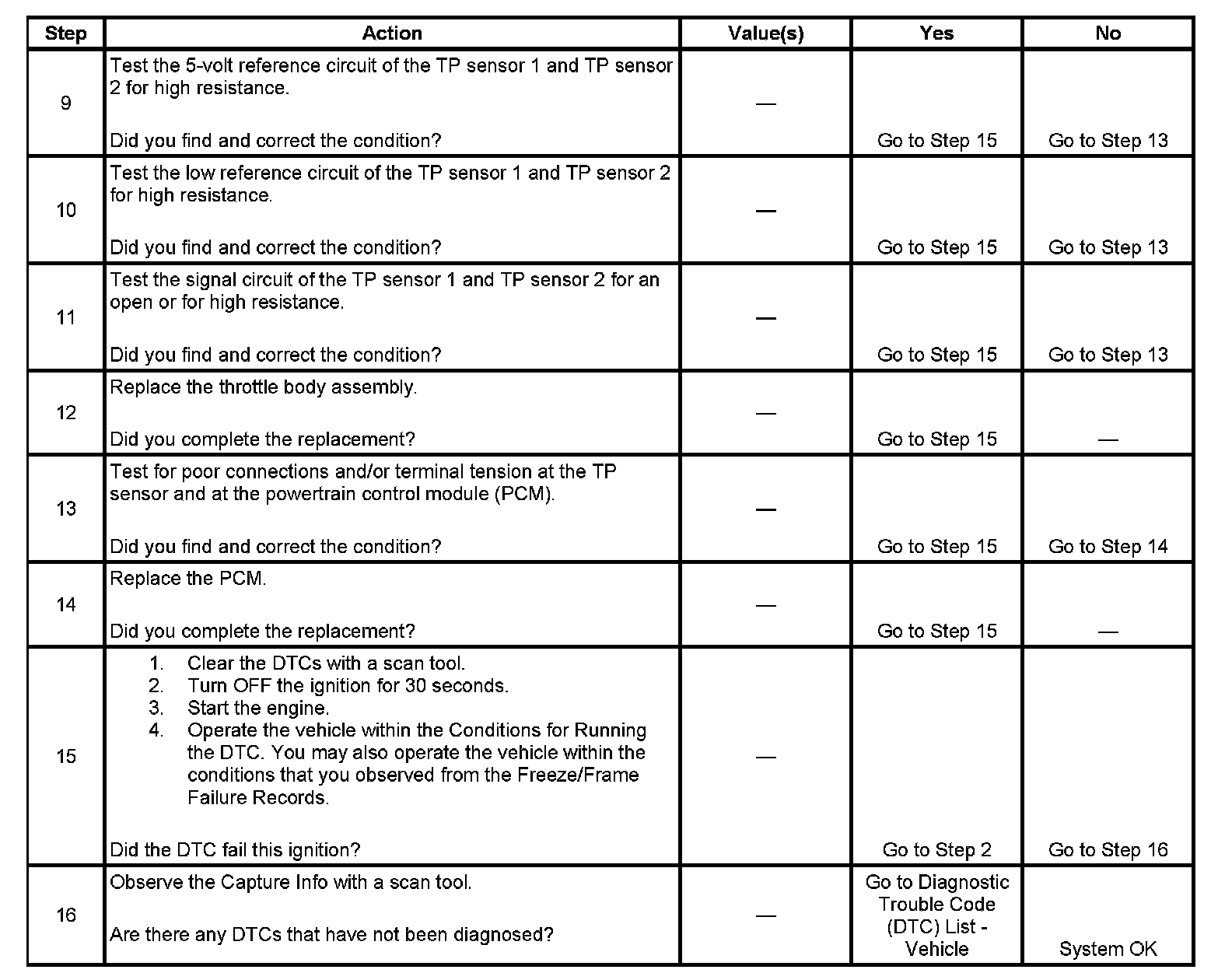 16. When the PCM detects a condition within the throttle control system, more than one related DTC may set. This is due to the many redundant tests run continuously on this system. Locating and repairing one individual condition may correct more than one DTC. Keep this in mind when reviewing captured DTC info.