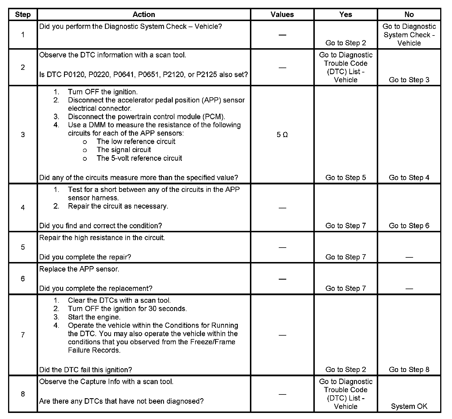 2. Any circuit faults on either APP sensor 1 or 2 will set one of the DTCs listed. Refer to the appropriate table for diagnosis.