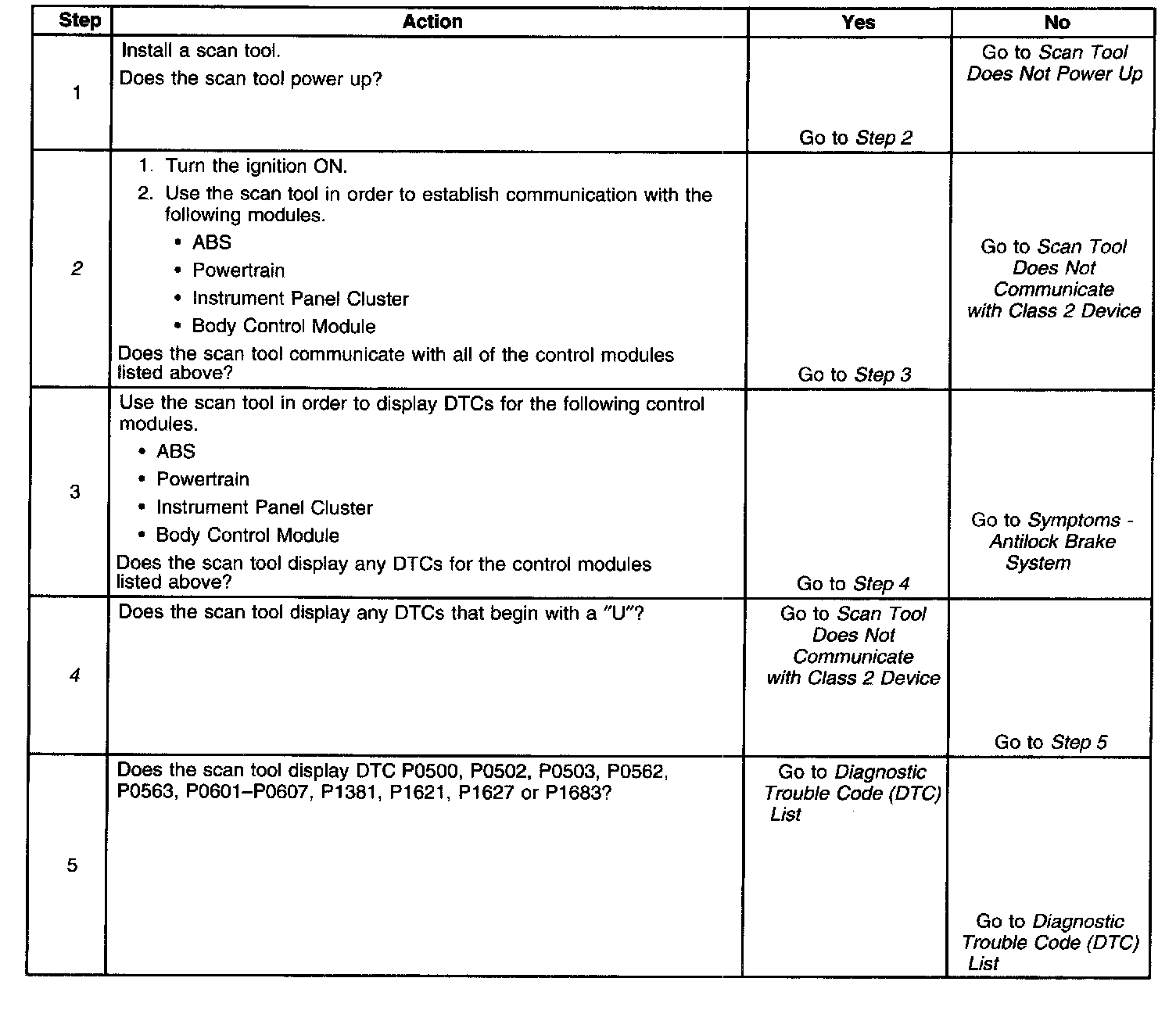 2. Lack of communication may be due to partial or total malfunction of the class 2 serial data circuit. The specified procedure will determine the particular condition.