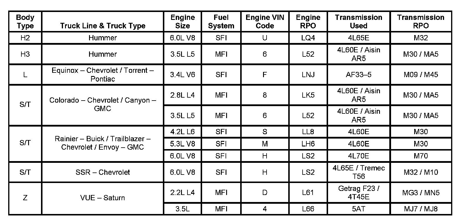 Engine and Transmission Usage (Mid-Size Truck Applications):