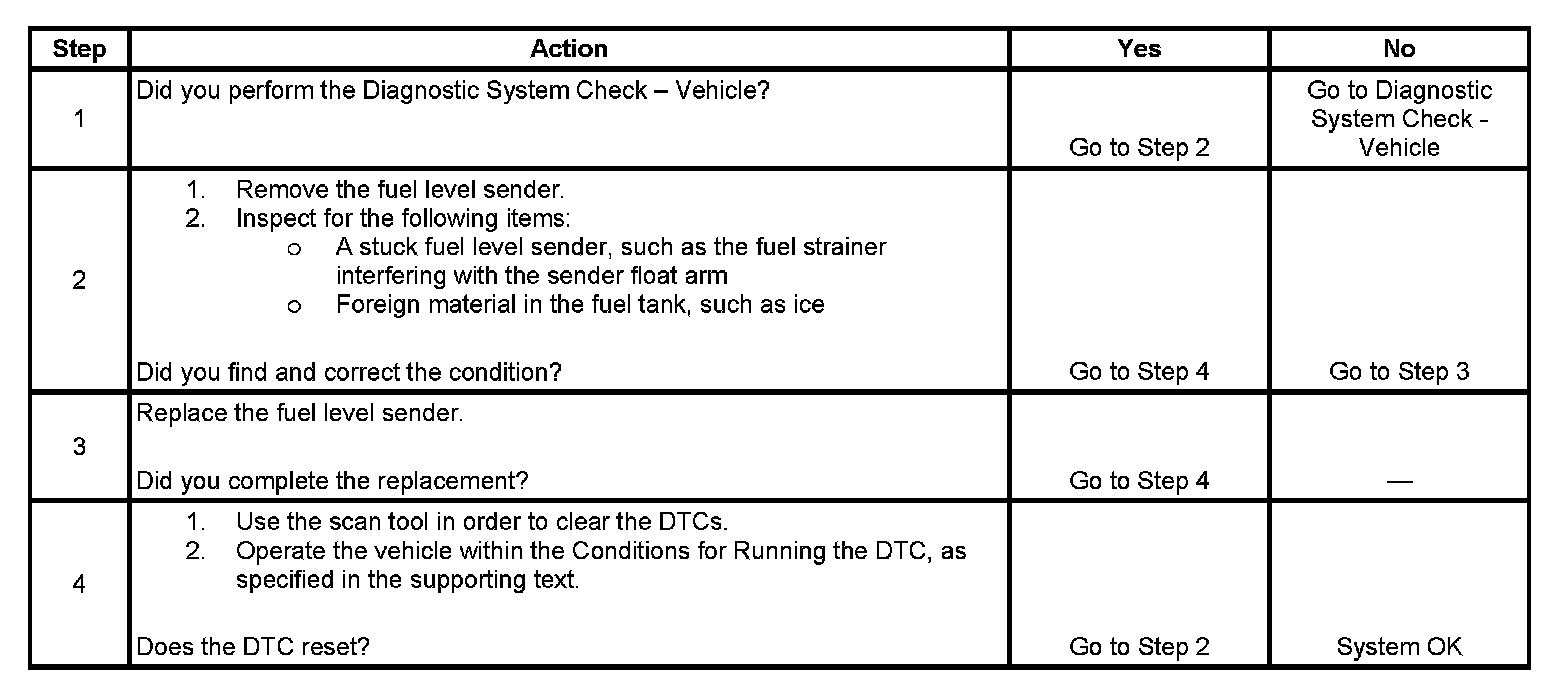 The fuel level sender changes resistance based on fuel level. The powertrain control module (PCM) monitors the signal circuit of the fuel level sender in order to determine fuel level. When the fuel tank is full, the sender resistance is high and the PCM senses a high signal voltage. When the fuel tank is empty, the sender resistance is low and the PCM senses a low signal voltage. The PCM uses the signal circuit of the fuel level sender in order to calculate the total remaining fuel percent in the tank. The PCM sends the fuel level percent via the class 2 serial data circuit to the instrument cluster in order to control the fuel gage. The fuel level information is also used for misfire and evaporative emission (EVAP) diagnostics.