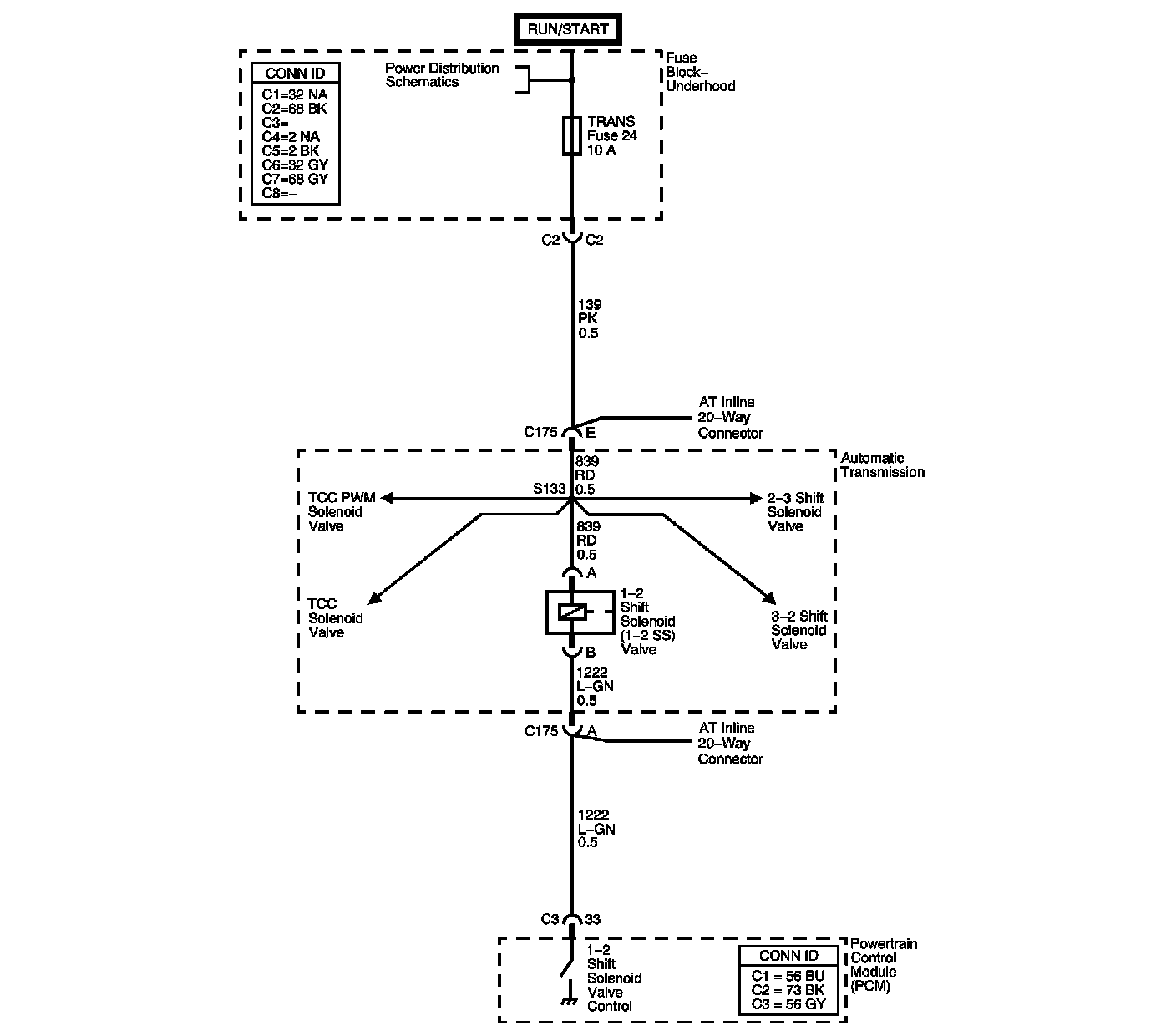 The 1-2 shift solenoid (SS) valve controls transmission fluid pressure acting on the 1-2 and 3-4 shift valves to position the valves for the appropriate gear. The 1-2 SS valve is a normally open exhaust valve located on the lower control valve body. Ignition voltage is supplied to the solenoid. The powertrain control module (PCM) commands the solenoid ON or OFF by providing a ground path. When the 1-2 SS valve is commanded ON, the PCM senses low voltage. When the 1-2 SS valve is commanded OFF, the PCM senses high voltage.