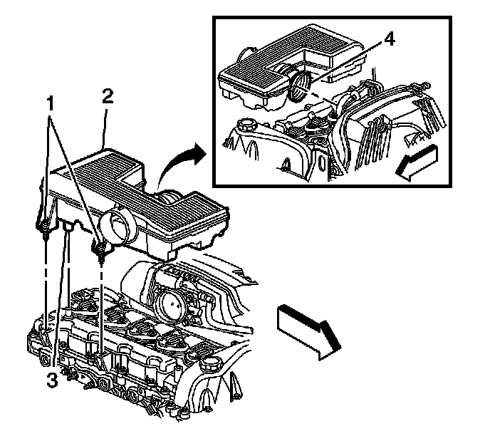 3. Align the air cleaner outlet resonator bolts (1) with the captured nuts on the camshaft cover.