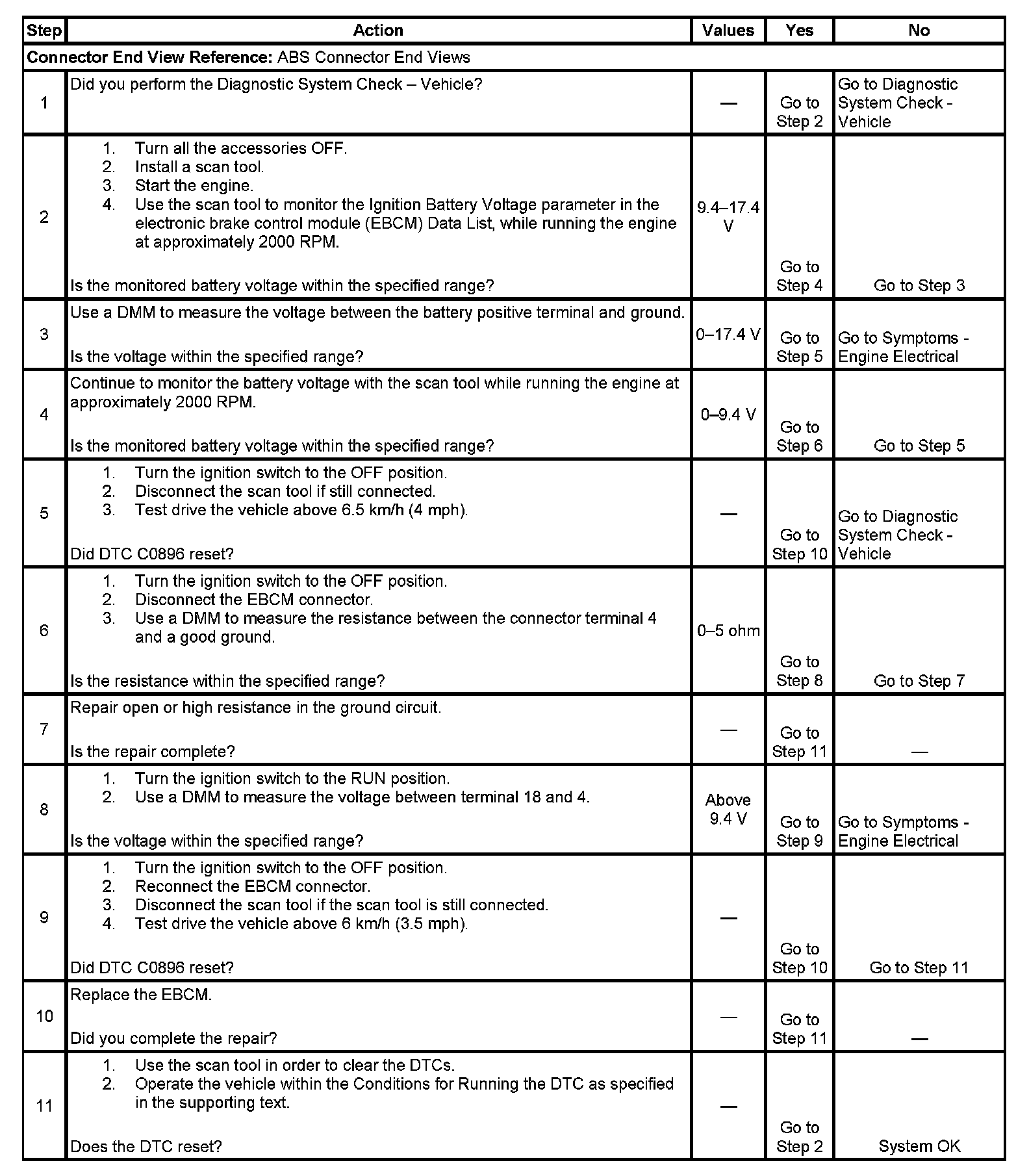 The electronic brake control module (EBCM) is required to operate within a specified range of voltage to function properly. During antilock brake system (ABS) and traction control system (TCS) operation, there are current requirements that will cause the voltage to drop. Because of this, voltage is monitored out of ABS/TCS control to indicate a good charging system condition, and also during ABS/TCS control when voltage may drop significantly. The EBCM also monitors for high voltage conditions which could damage the EBCM.