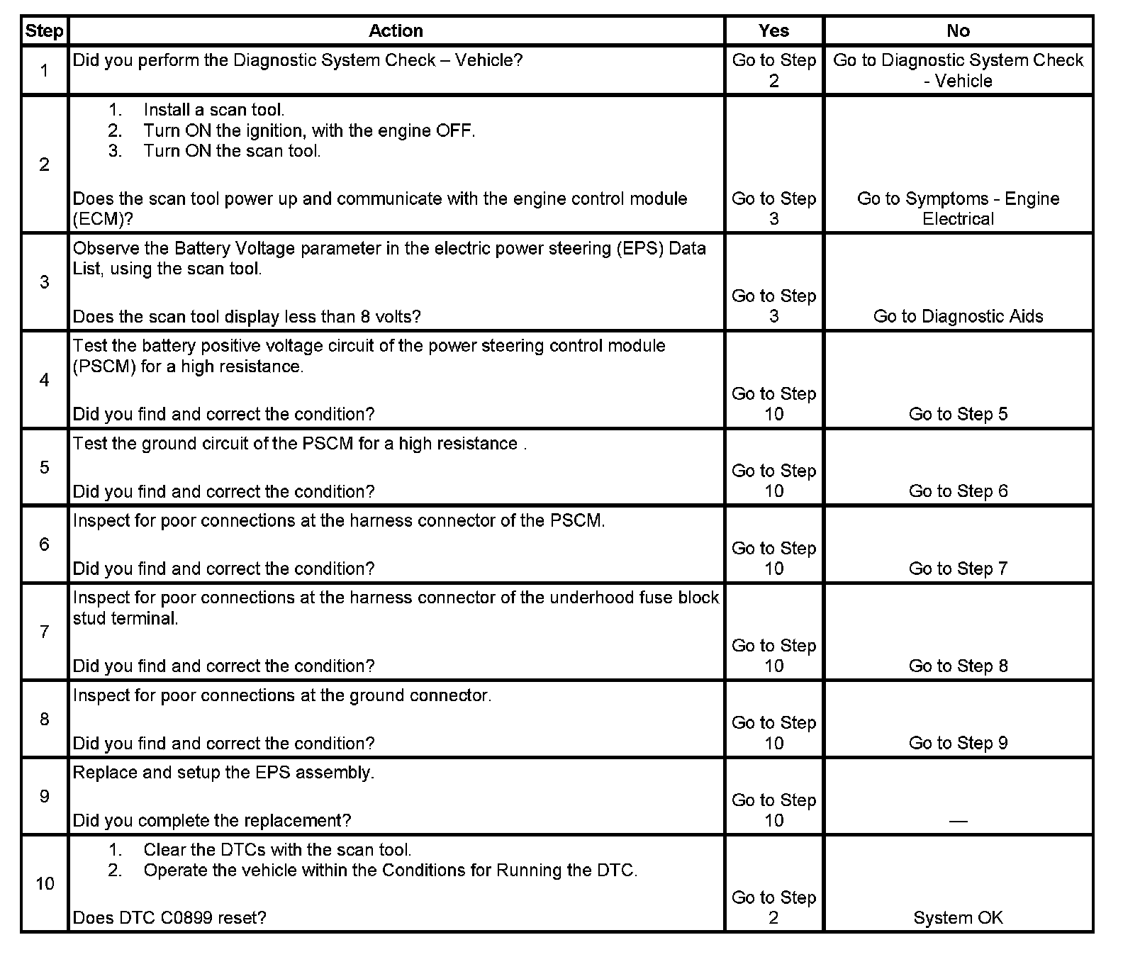 The power steering control module (PSCM) has a discrete battery positive voltage supply circuit. The PSCM monitors the voltage level on this circuit to ensure the electric power steering (EPS) system has adequate voltage levels to perform the system functions. If the voltage level is low, DTC C0899 sets.