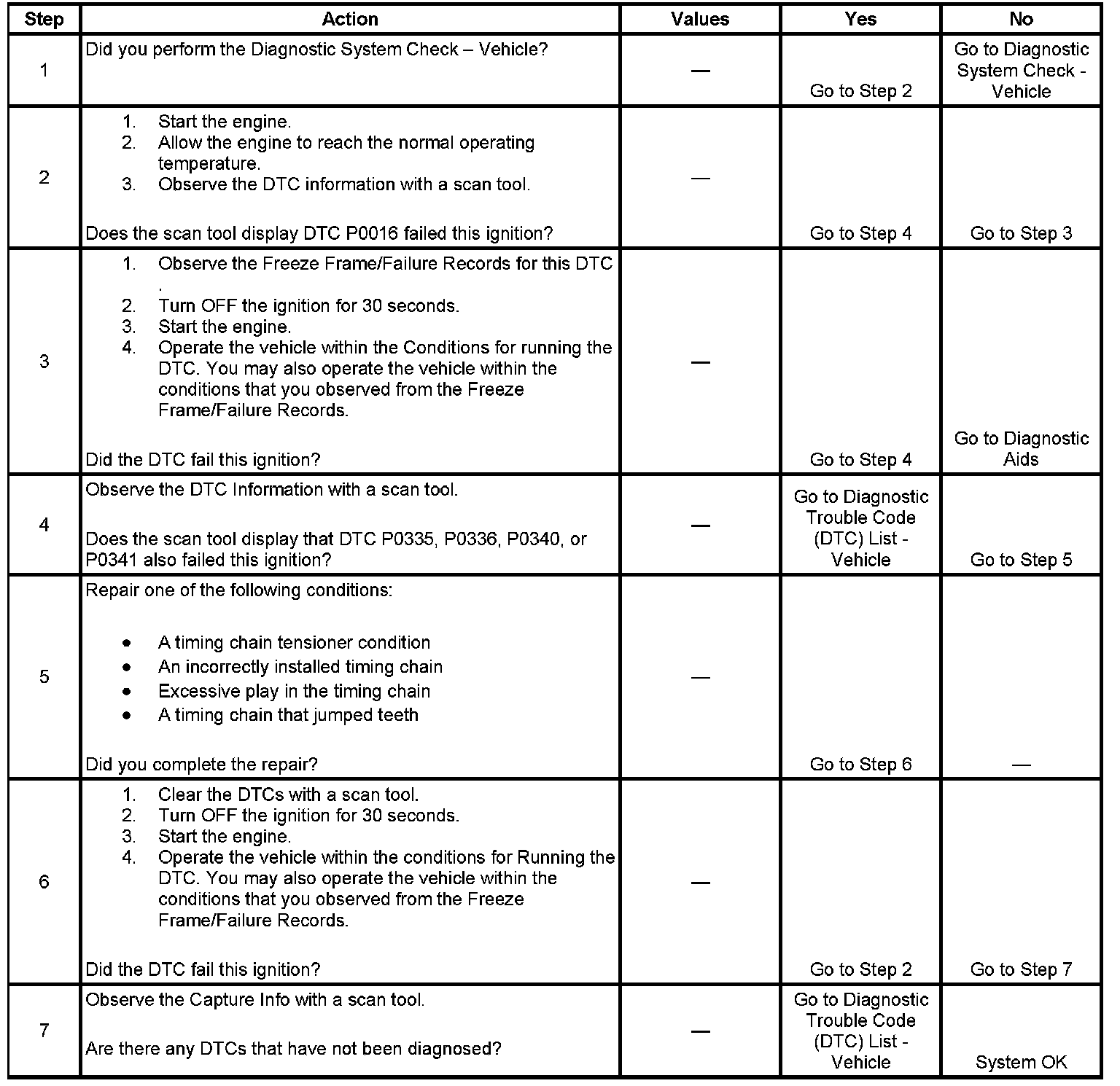 5. This step inspects for any recent engine mechanical repairs. An incorrectly installed camshaft, crankshaft or timing chain can cause this DTC to set.