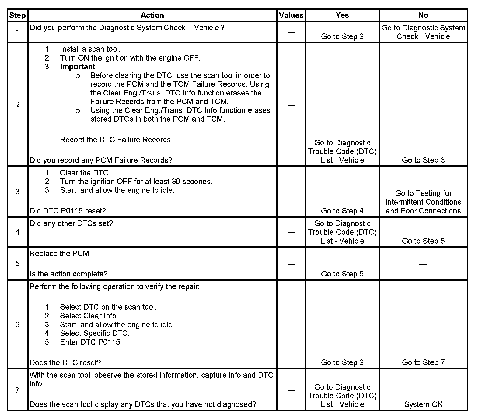 When the TCM receives invalid engine coolant temperature data from the PCM, then DTC P0115 will set. DTC P0115 is a type C DTC.