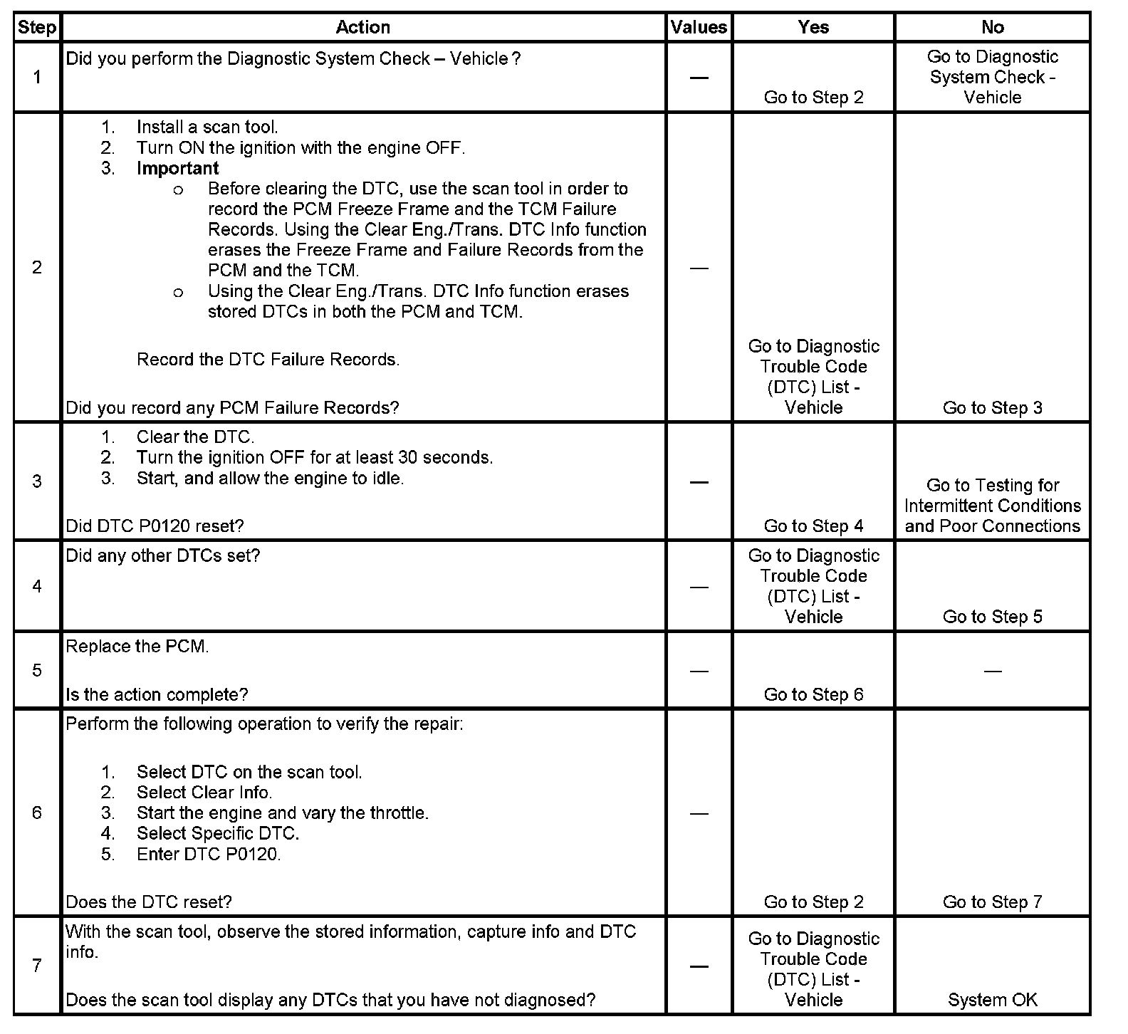When the TCM receives invalid throttle position data from the PCM, then DTC P0120 will set. DTC P0120 is a type A DTC.