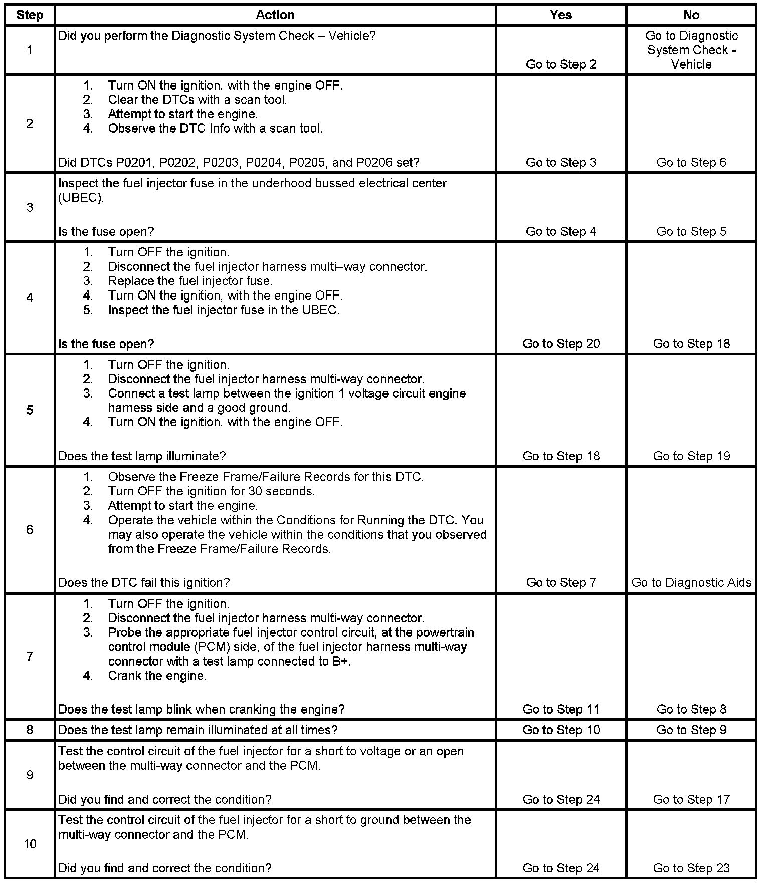 The powertrain control module (PCM) enables the appropriate fuel injector for each cylinder. A voltage is supplied directly to the fuel injectors. The PCM controls each fuel injector by grounding the control circuit via a solid state device called a driver. The PCM monitors the status of each driver. If the PCM detects an incorrect voltage for the commanded state of the driver, a fuel injector control DTC P0201-P0206 sets.