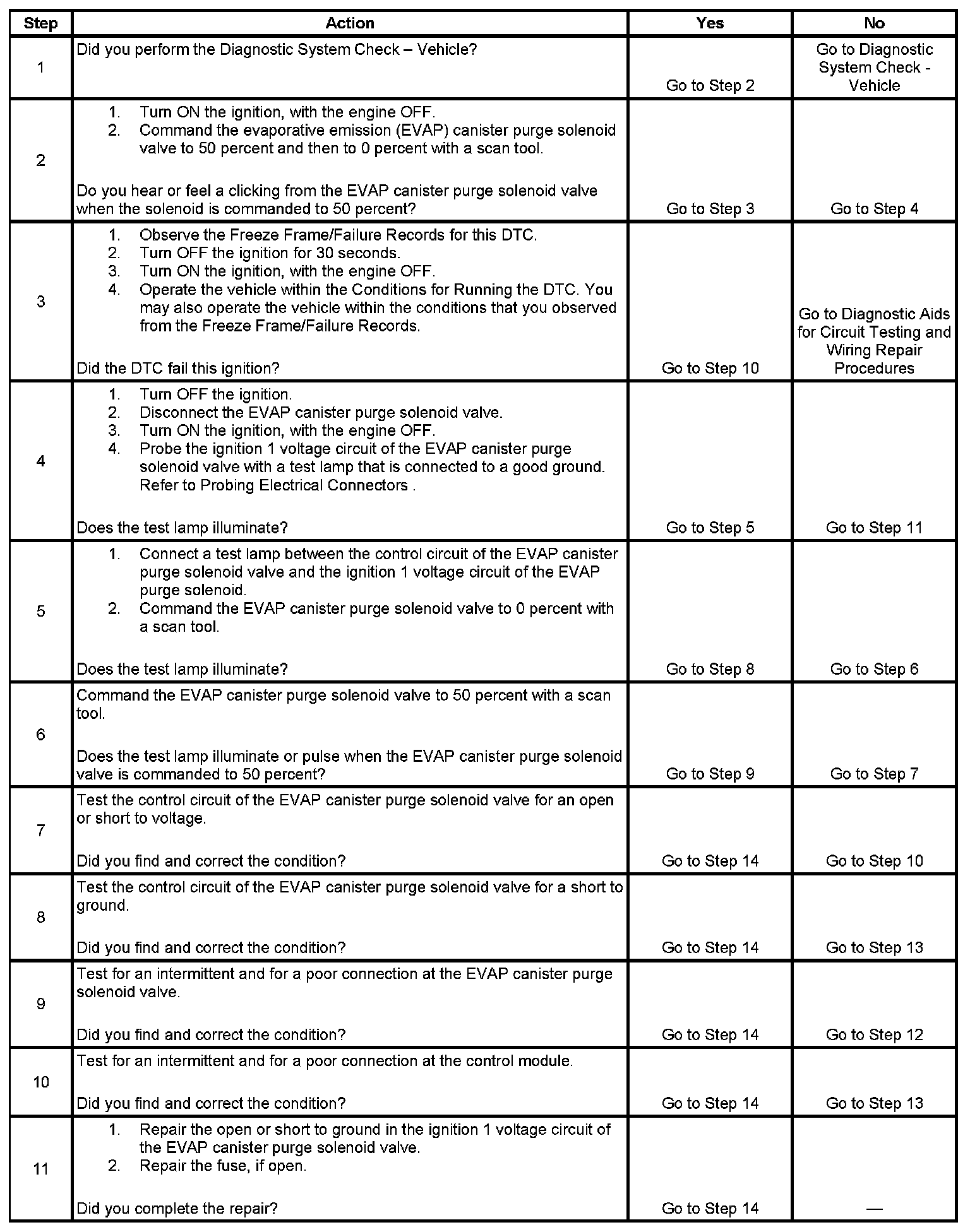 An ignition voltage is supplied directly to the evaporative emission (EVAP) canister purge solenoid valve. The EVAP canister purge solenoid valve is pulse width modulated (PWM). The scan tool displays the amount of ON time as a percentage. The control module monitors the status of the driver. The control module controls the EVAP canister purge solenoid valve ON time by grounding the control circuit via an internal switch called a driver. If the control module detects an incorrect voltage for the commanded state of the driver, this DTC sets.