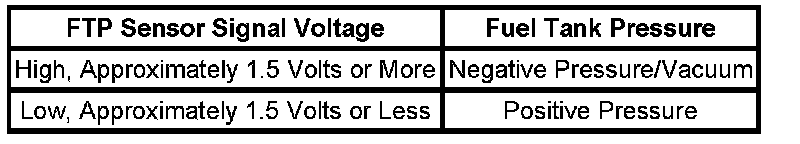 The table illustrates the relationship between the FTP sensor signal voltage and the EVAP system pressure/vacuum.