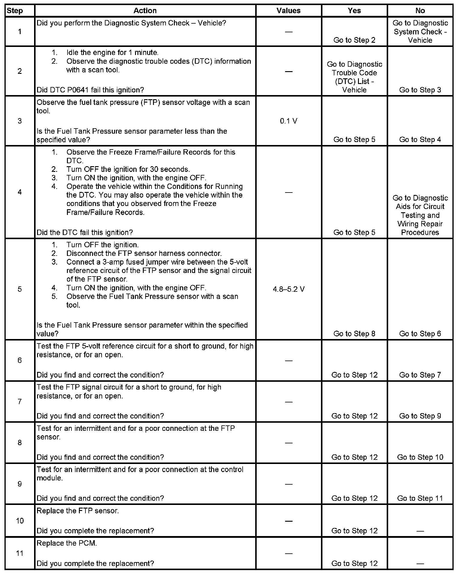 The fuel tank pressure (FTP) sensor measures the difference between the air pressure or vacuum in the evaporative emission (EVAP) system, and the outside air pressure. The control module supplies a 5-volt reference and a low reference circuit to the FTP sensor. The FTP sensor signal circuit voltage varies depending on EVAP system pressure or vacuum. If the FTP sensor signal voltage goes below a calibrated value, this DTC sets.