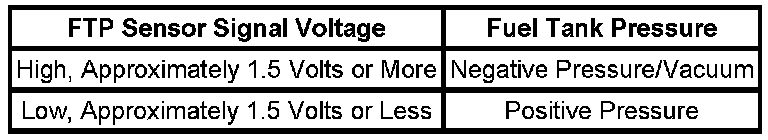 The table illustrates the relationship between FTP sensor signal voltage and the EVAP system pressure/vacuum.
