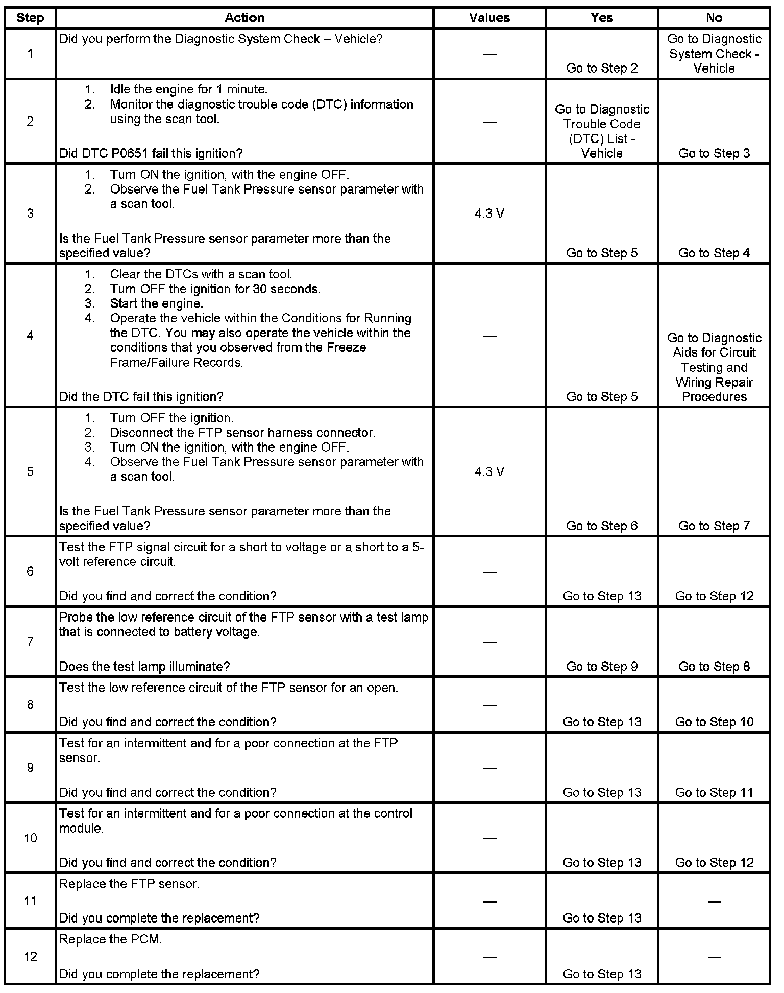 The fuel tank pressure (FTP) sensor measures the difference between the air pressure or vacuum in the evaporative emission (EVAP) system, and the outside air pressure. The control module supplies a 5-volt reference and a low reference circuit to the FTP sensor. The FTP sensor signal circuit voltage varies depending on EVAP system pressure or vacuum. If the FTP sensor signal voltage increases above a calibrated value, this DTC sets.