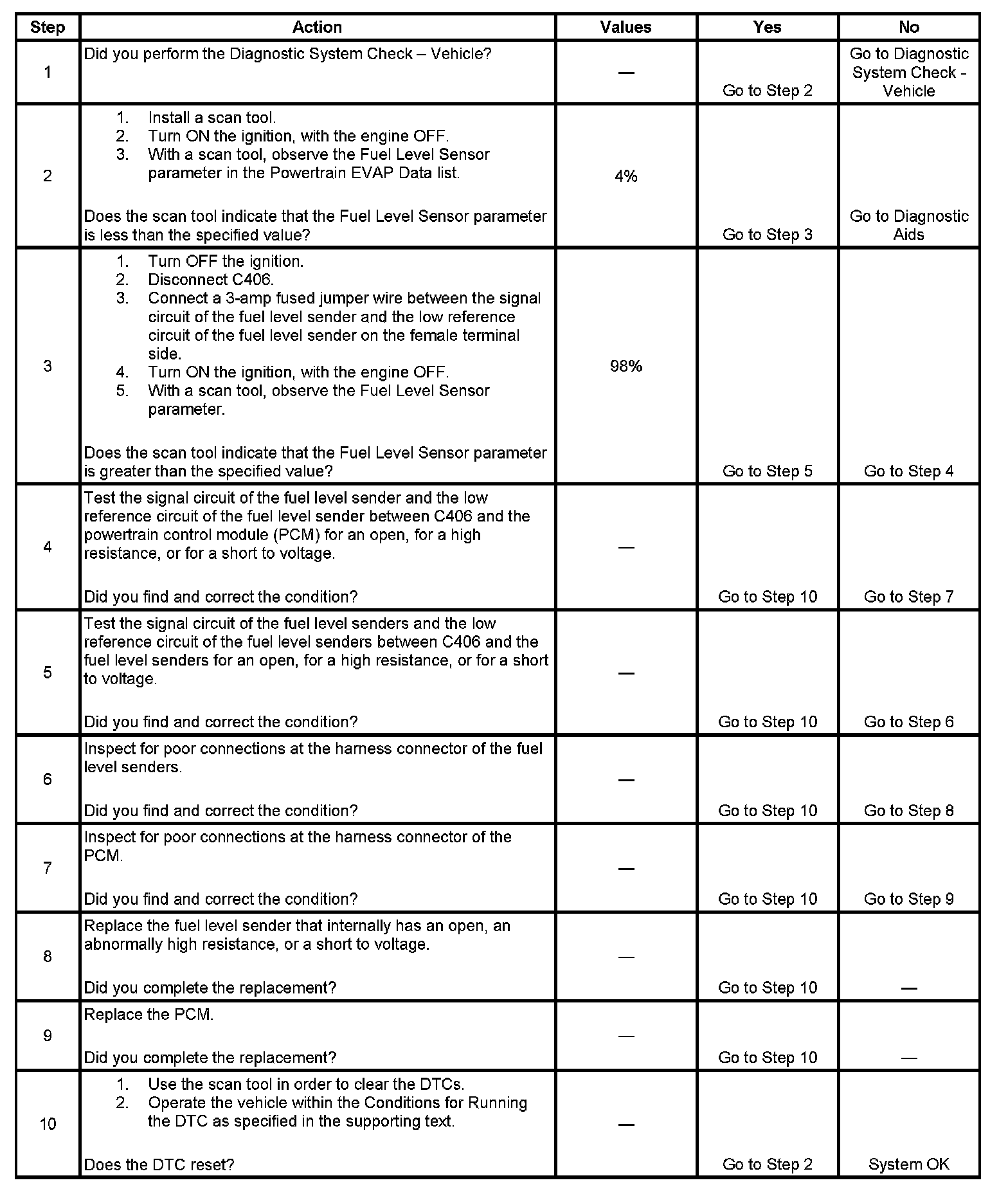 This diagnostic tests for a higher than normal fuel level sender signal.