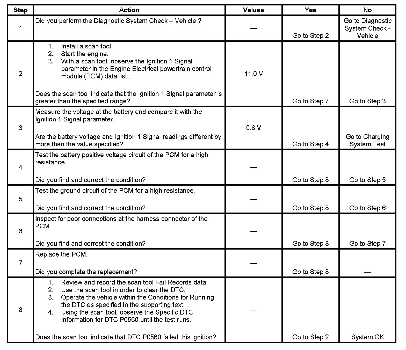 The powertrain control module (PCM) monitors the system voltage to ensure that the voltage stays within the proper range. Damage to components, and incorrect data input can occur when the voltage is out of range. The PCM monitors the system voltage over an extended length of time. If the PCM detects a system voltage outside an expected range for the calibrated length of time, DTC P0560 will set.