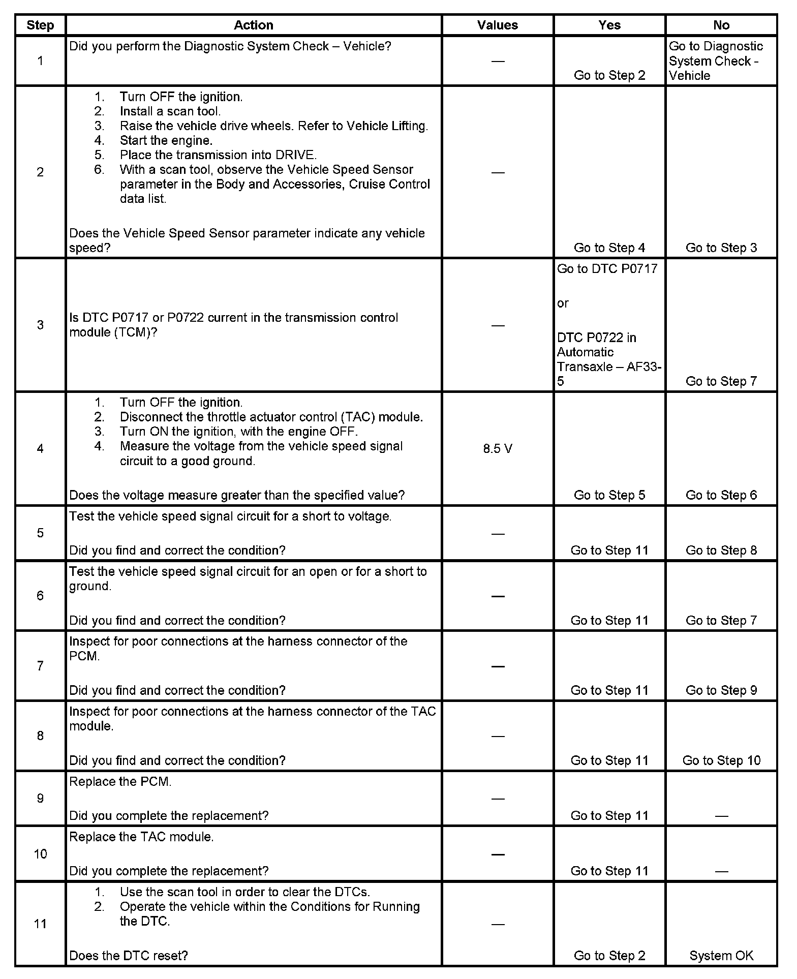 The vehicle speed signal circuit is an input to the throttle actuator control (TAC) module from the powertrain control module (PCM). The PCM provides a constant voltage signal on the vehicle speed signal circuit. The PCM creates the vehicle speed signal by internally pulsing the vehicle speed signal to ground. The TAC module uses the vehicle speed signal from the PCM, in order to determine the vehicle speed. The TAC module then sends a universal asynchronous receiver transmitter (UART) serial data message to the PCM indicating the vehicle speed that the TAC module has detected.