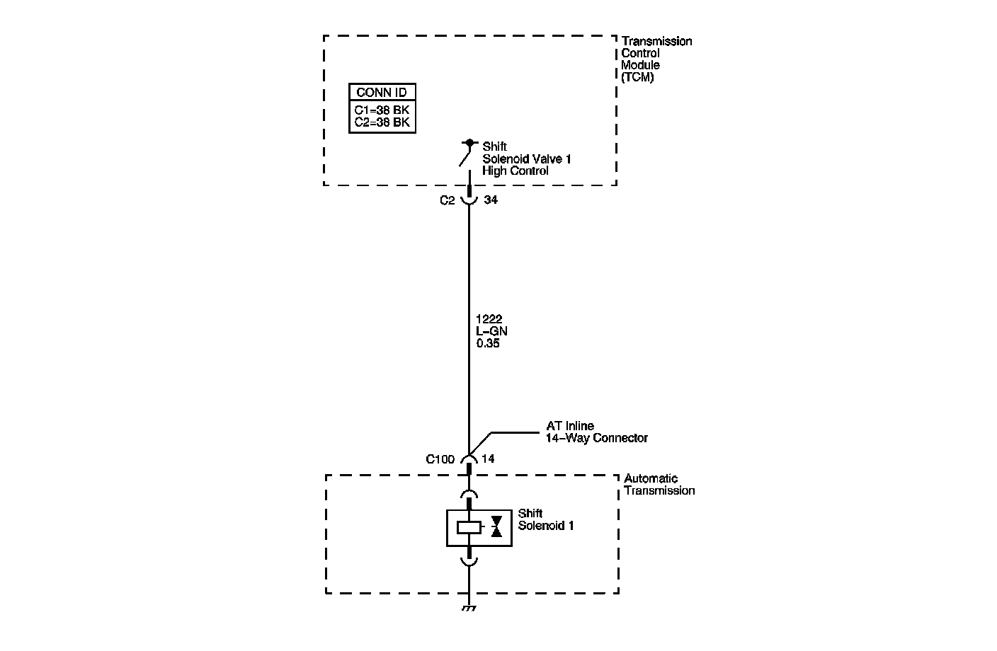 The reverse, 1st shift solenoid (SS) valve (S1) is commanded ON in NEUTRAL and first gear. The reverse, 1st SS valve (S1) controls transmission fluid pressure acting on the neutral relay and M1 shift valves to position the valves for the appropriate gear. The reverse, 1st SS valve (S1) is a normally open exhaust valve located on the front control valve body. The solenoid is case grounded. The output driver module (ODM), within the transmission control module (TCM), commands the solenoid ON or OFF by providing voltage. When the reverse, 1st SS valve (S1) is commanded ON, the TCM senses high voltage. When the reverse, 1st SS valve (S1) is commanded OFF, the TCM senses low voltage.