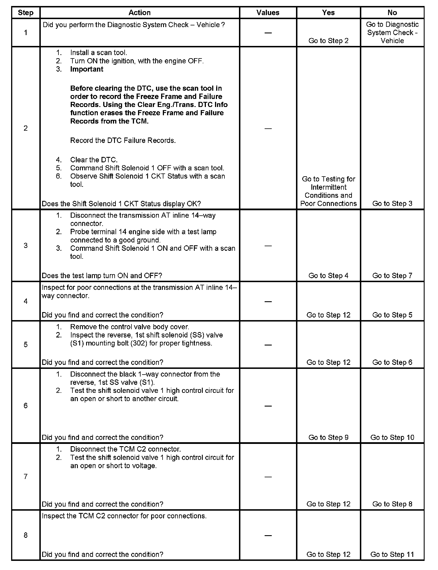 The reverse, 1st SS valve (S1) feedback circuit indicates a continuous open or short to voltage for 0.5 seconds.