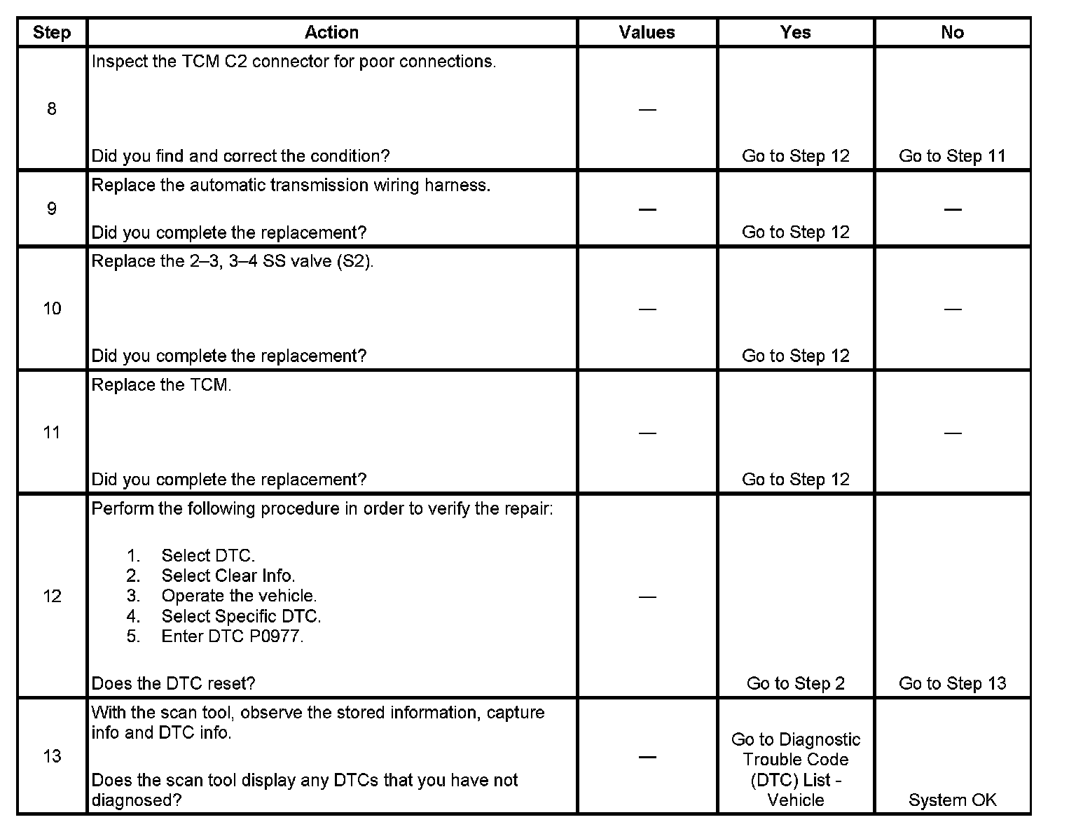 If the TCM detects a continuous open or short to voltage in the 2-3, 3-4 SS valve (S2) circuit, then DTC P0977 sets. DTC P0977 is a type A DTC.