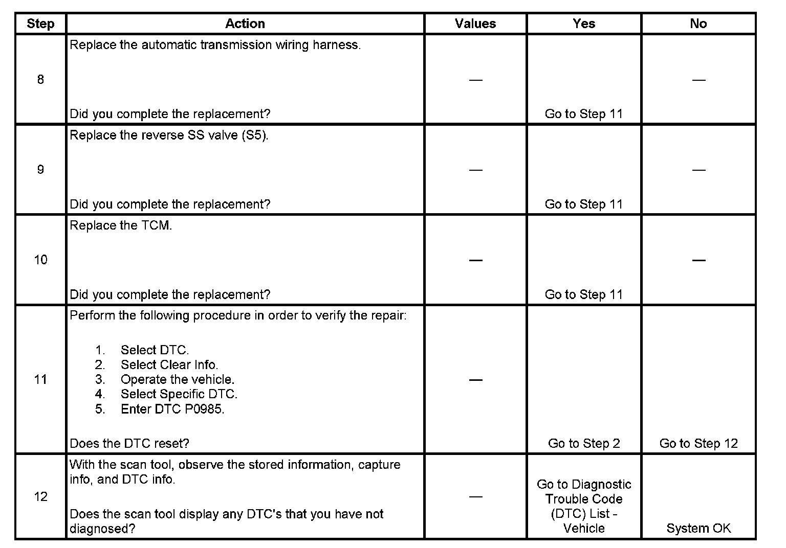 If the TCM detects a continuous short to ground in the reverse SS valve (S5) circuit, then DTC P0985 sets. DTC P0985 is a type A DTC.