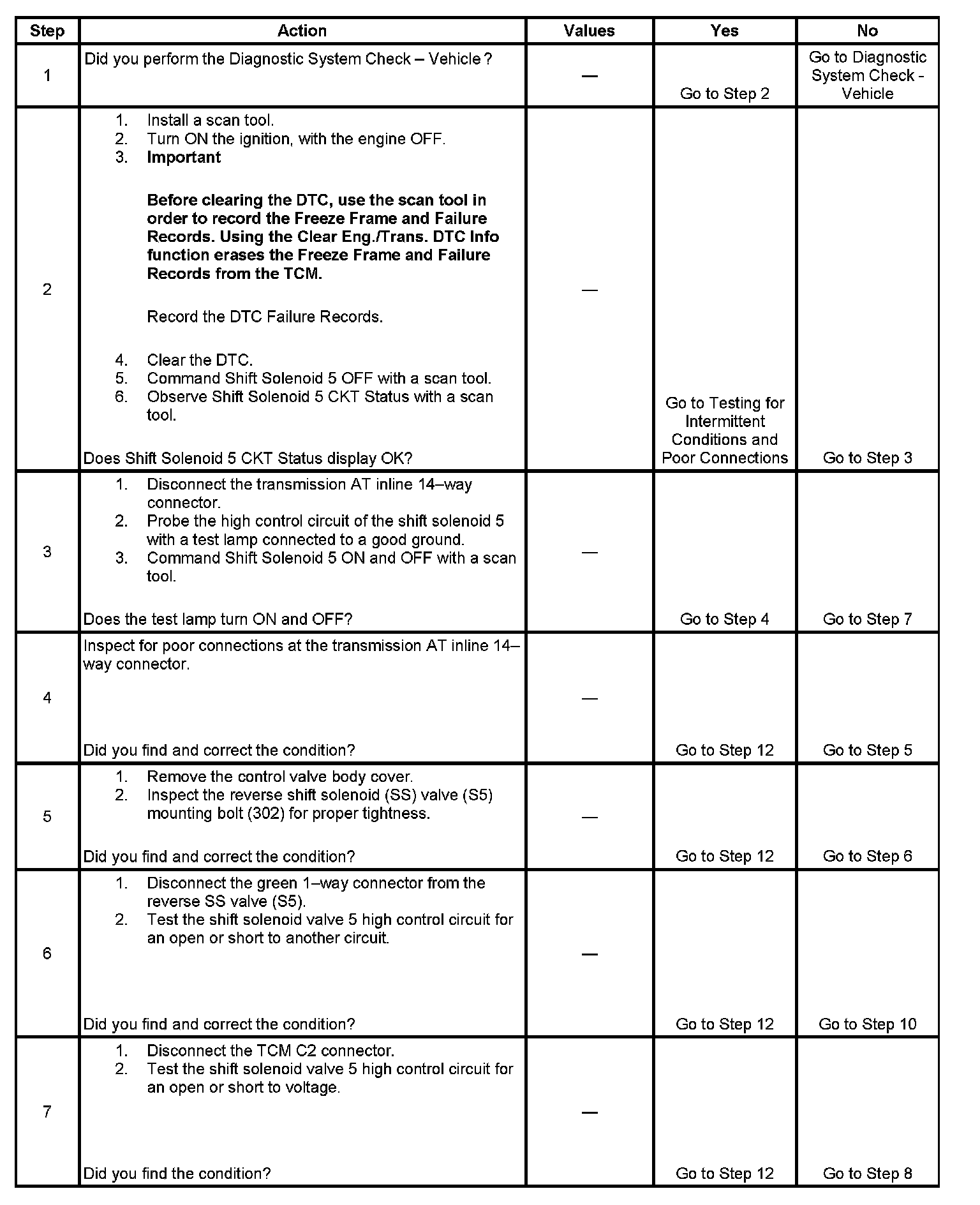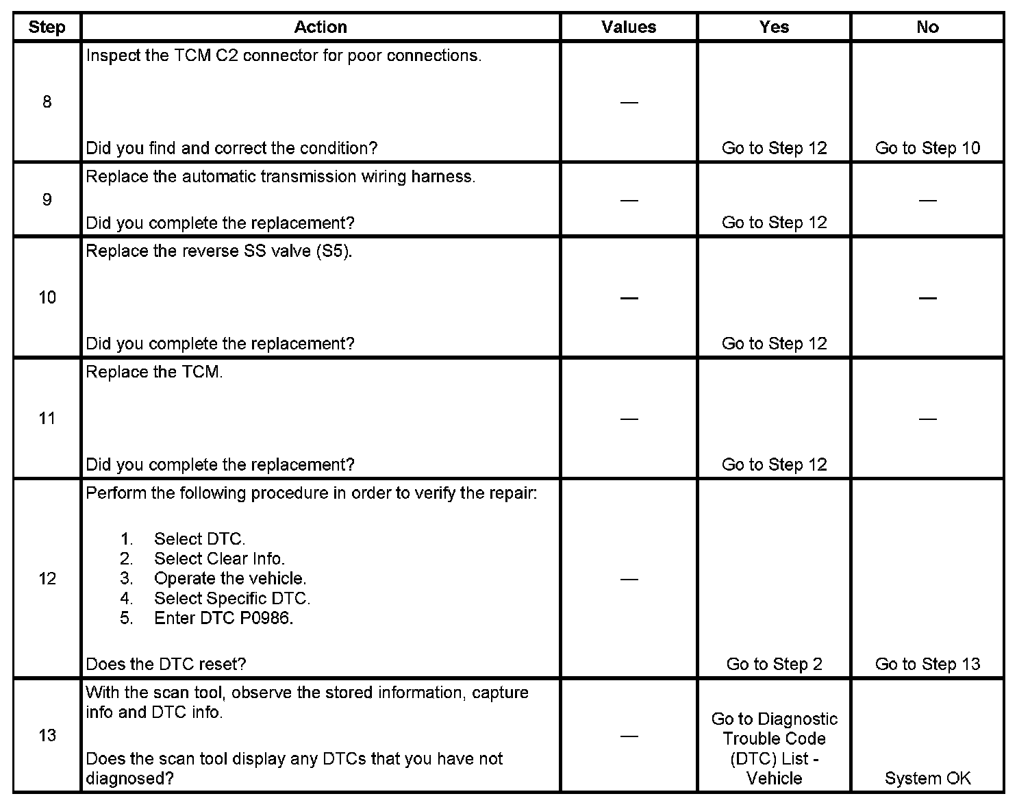 If the TCM detects a continuous open or short to voltage in the reverse SS valve (S5) circuit, then DTC P0986 sets. DTC P0986 is a type A DTC.