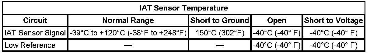 - If more than specified temperature then, test the signal circuit of the IAT sensor for a short to ground or a short to the IAT low reference circuit and repair as necessary. Test for an intermittent and for a poor connection at the control module. If all circuits test OK then replace the control module.