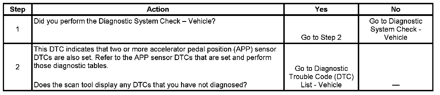 The control module provides the APP sensors a 5-volt reference circuit and a low reference circuit. The APP sensors then provide the control module signal voltages proportional to pedal movement. The APP sensor 1 signal voltage is low at rest and increases as the pedal is depressed. The APP sensor 2 signal voltage is also low at rest and increases as the pedal is depressed. One APP sensor DTC will not cause the Reduced Engine Power message to be displayed. Two APP sensor DTCs for the same sensor also will not cause the Reduced Engine Power message to be displayed. However, if 2 or more DTCs are set involving more than one APP sensor, DTC P1125 will set.