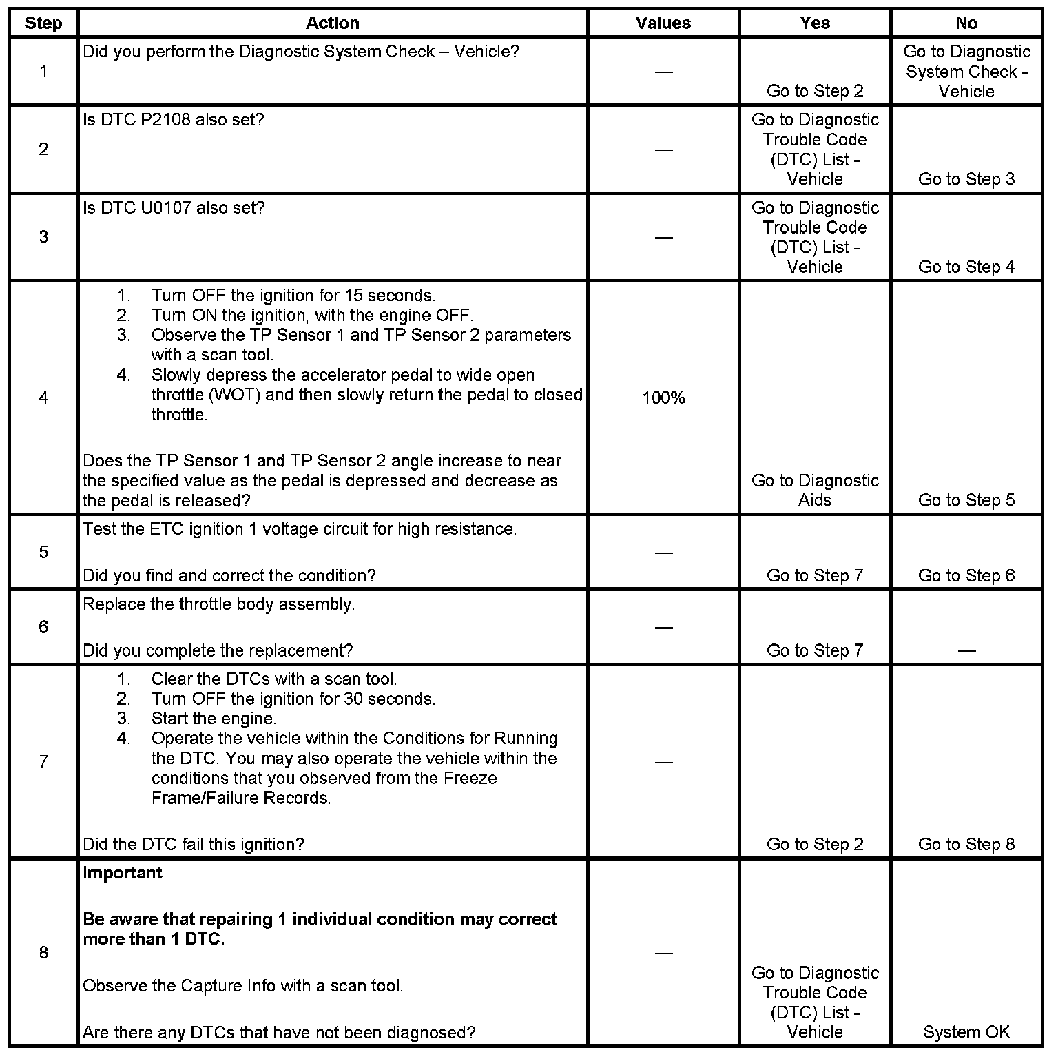 - DTCs P0068, P0120, P0220, P0601, P0604, P0606, P1125, P1516, P2108, P2119, P2120, P2125, P2135, P2138, and U0107 are not set.