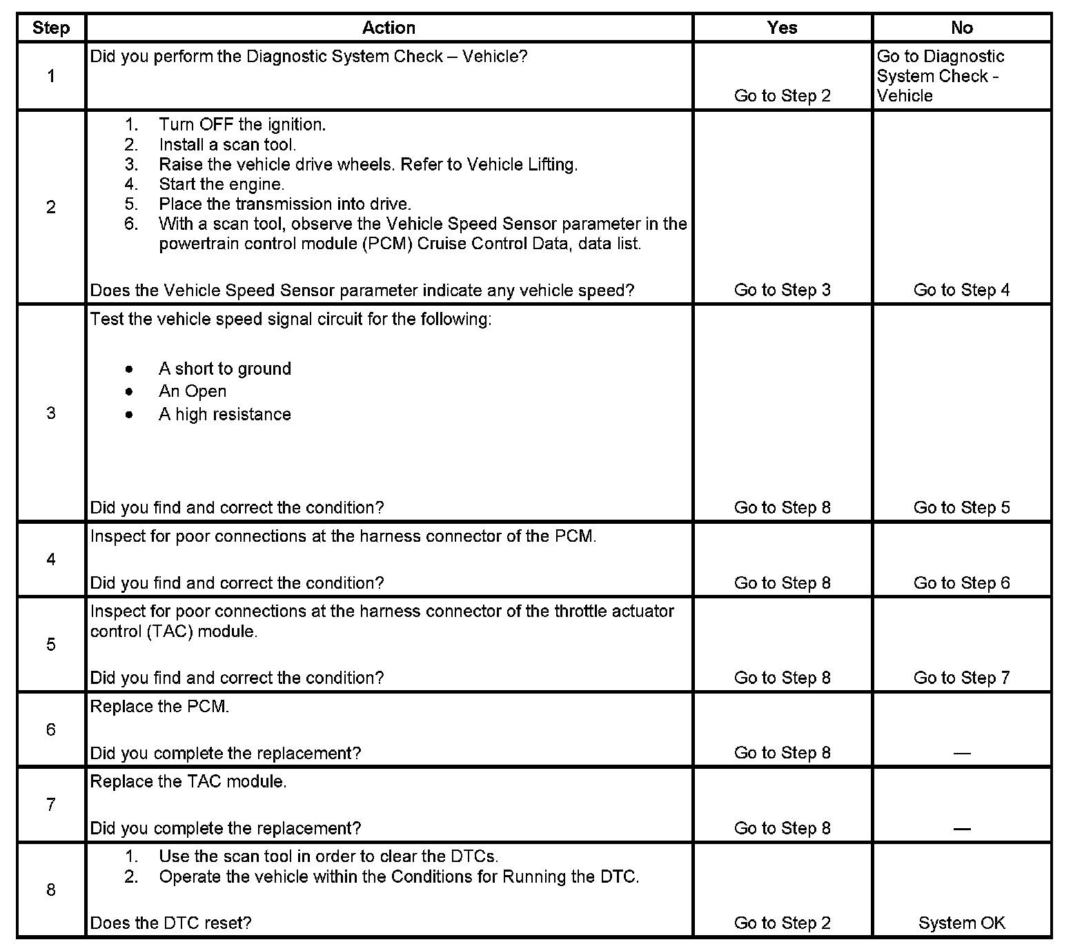 The vehicle speed signal circuit is an input to the throttle actuator control (TAC) module from the powertrain control module (PCM). The PCM provides a constant voltage signal on the vehicle speed signal circuit. The PCM creates the vehicle speed signal by internally pulsing the vehicle speed signal to ground. The TAC module uses the vehicle speed signal from the PCM, in order to determine the vehicle speed. The TAC module then sends a universal asynchronous receiver transmitter (UART) serial data message to the PCM indicating the vehicle speed that the TAC module has detected.