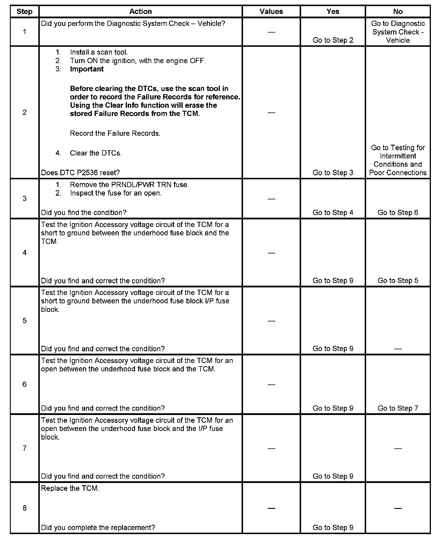 If the TCM detects a low voltage on the Ignition Accessory voltage circuit, DTC P2536 sets. DTC P2536 is a type A DTC.