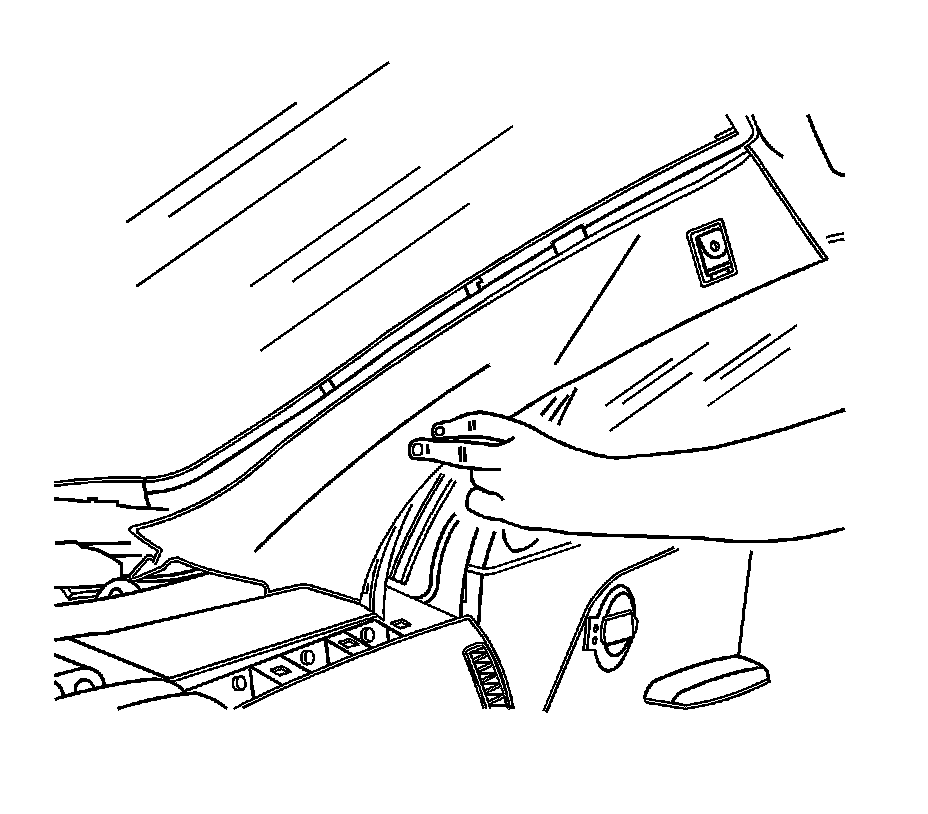 1. Using a small flat-bladed tool, remove the fastener cover from the windshield upper garnish molding, by prying at the bottom edge.