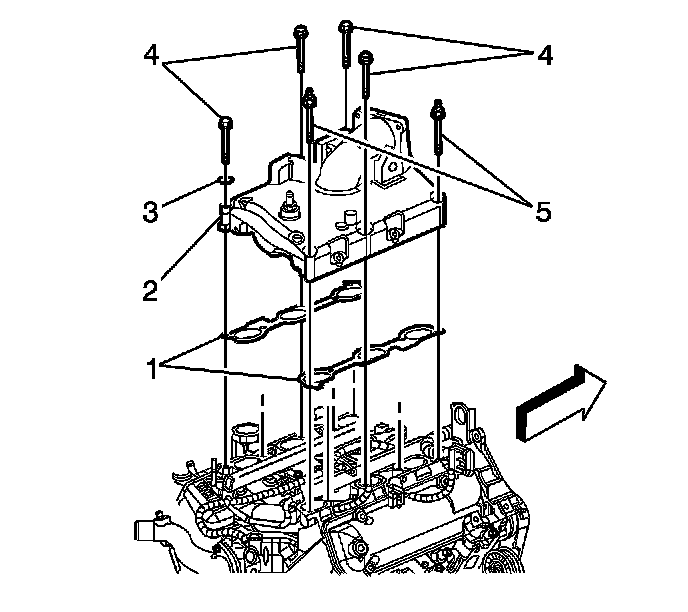 Apply threadlock GM P/N 12345382 (Canadian P/N 10953489) to the bolt threads. Install the upper intake manifold bolts (4, 5).