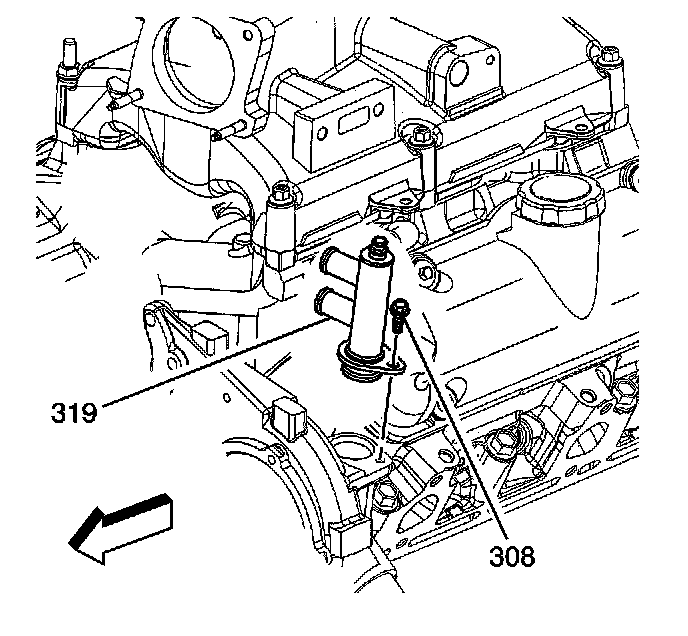 7. Install the heater outlet pipe adapter bolt (308).