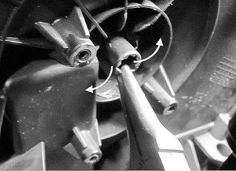 14. Inspect the end of the temperature door shaft. Remove any loose door shaft pieces and discard. Confirm that the end of the shaft has in some part weakened or completely separated from the temperature control door. Gently rotating the end of the shaft should confirm this condition.
